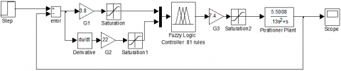 Figure 17 depicts the block diagram for the 81-Rule FC. While G1=3.8, G2=0.22, and G3=7.4, the tuned gains (scaling factors) are: G2=0.22, G3=7.4. Figure 18 represents this controller's step response.