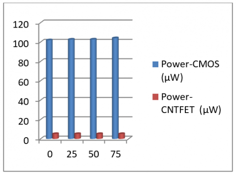 When the temperature is varied from 0℃ to 75℃, Table 4 illustrates the Delay and Average Power Consumption using CMOS and CNTFET while Table 5 represents power-delay-product. The tables demonstrates that the delay in proposed CNTFET is smaller than the delay in CMOS, and that the power consumption in CNTFET is likewise much lower than the power consumption in CMOS. In addition, while comparing CNTFET with CMOS, it can be shown that the power delay product is lower in proposed CNTFET. Average Power Comparison on Different Input Voltages and on different temperatures of Hamming Error Detection are represented by Figure 5 and Figure 6 respectively. Figure 7 and Figure 8 represents PDP as a function of supply voltage and temperature of Hamming Error Detection respectively.
