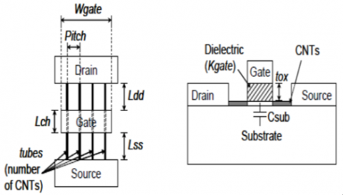 Figure 1 shows a CNTFET schematic with single-walled CNTs sandwiched between two electrodes. Highly doped CNTs are placed between the gate and source/drain electrodes. Undoped CNTs under the gate electrode form the channel [6, 11].