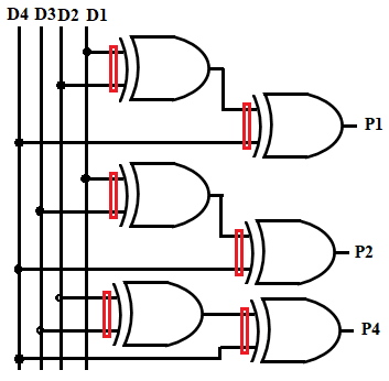 P1=Ex-OR(D1, D2, D4)=Ex-OR (1, 0, 1)