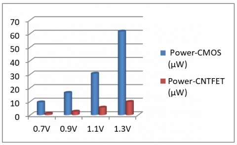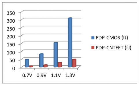 When the input voltage is varied from 0.7V to 1.3V, Table 6 illustrates the Delay and Average Power Consumption using CMOS and CNTFET while Table 7 represents power-delay-product. The tables demonstrates that the delay with CNTFET is shorter than the delay with CMOS, and that the power consumption with CNTFET is less than the power consumption with CMOS. In addition, the power delay product of CNTFET is lower than that of CMOS.