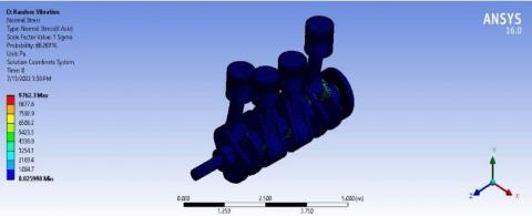 For the simulation of the mechanical stresses caused by random vibrations, because the engine works under real circumctnaces (not therotical) and unexpected incedints that will generate random vibrations. Thoes vibrations were simulated in the form of applied forces in a random manner, and at different frequencies (100-500 Hz). The results indicate a maximum vertical stress of 9762.2 Pa and a maximum shear stress of 4599.9 Pa in absolute values distributed mainly across the pistons’ heads and connecting rods (see Figure 6).