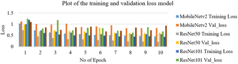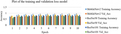 Figure 9 illustrates the trained and validated loss of each of the model, whereas Figure 10 shows the trained and validated accuracy for each of the model. In each of the epochs, ResNet50 had lowest training loss and had the highest training accuracy. This implies that the lung diseases were able to train well on the ResNet50 model.