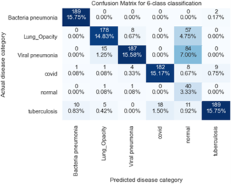 Figure 8. Confusion matrix for AlexNet for 6-subclass classification for detection of lung-related diseases