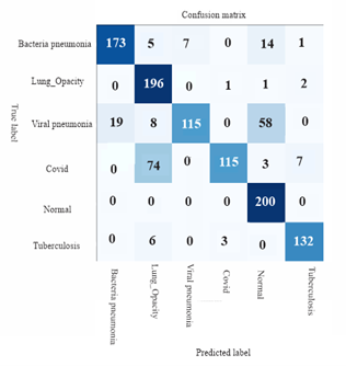 Figure 5. Confusion matrix for MobileNetv2 for 6-subclass classification for classification of lung-related diseases