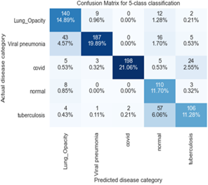 Figure 13. Confusion matrix for ResNet50 for 5-subclass classification for detection of lung-related diseases