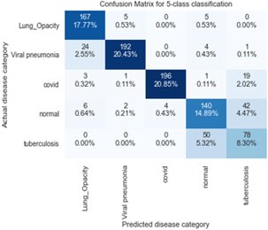 Figure 11 depicts Confusion matrix for MobileNetv2 for 5-subclass classification for the classification of lung-related diseases while Figure 12 shows the confusion matrix for ResNet101 for 5-subclass classification for detection of lung-related diseases while Figures 12 and 13 show the confusion matrix for ResNet50 and ResNet101 for 5-subclass classification for detection of lung-related diseases respectively. Finally, Figure 14 shows the confusion matrix for AlexNet for 5-subclass classification for the classification of lung-related diseases.