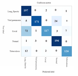 Moreover, MobileNetV2, ResNet50, ResNet101, and AlexNet architectures were trained on a total of 5,000 datasets for five-subclass classification. Chest x-ray consists of 1,000 images each for the lung-related disease (Lung-Opacity, COVID-19, Viral pneumonia, normal, and tuberculosis) with the dataset divided in the proportion of 80:20 for training and testing, the training dataset was additionally divided into training and validation.