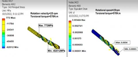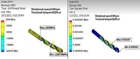 A Visual Fortran programmed can be used to obtain theoretical stress and strain results in order to verify that the torsional stress and strain occur at the root of the tool and draw these results in Figures 8, 9, 10, and 11.