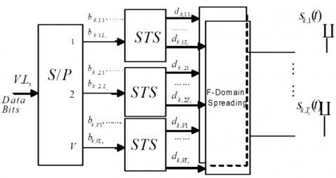In the system model, we are using single receiving antenna, Tx number of transmitting antennas and V*S number of frequency subcarriers. K user signals are transmitted synchronously in this MC DS-CDMA scheme. Per the Figure 1, we are investigating the kth user where real-valued data symbol using binary phase shift keying (BPSK) modulation and real-valued spreading is considered. A block of V.Lx data bits each having a bit duration of Tb is serial to parallel converted to $V$ parallel subblocks. Each parallel sub-blocks have Lx data bits which are space-time spread using the scheme described in Figure 3. With the aid of Mx number of orthogonal spreading codes e.g.,