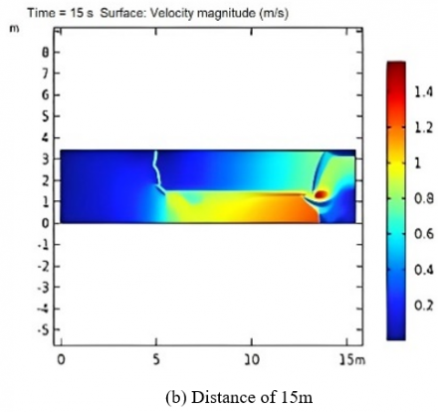 Table 1 shows the magnitude of the wave height that occurs in the interval t(0, 15), which gives the result that for a breakwater that is 19.52m, it gives a large wave height on the surface that is equal to 0.12515m, which is the minimum wave height value from a variation of 9.52m, which is 0.13097m, and a distance of 14.52m produces a wave height of 0.13161m. To provide a difference in the computational results that have been obtained, computations will be carried out on variations in the speed of the incoming wave propagation with the assumption that the breakwater is positioned at=16.92m with variations in speed, namely 1m/s, 1.5m/s, and 2m/s. The simulation is shown in Figure 12.