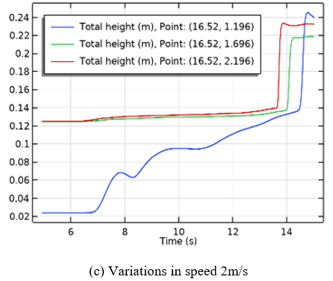 Figure 12 represents the change in amplitude that occurs due to wave breaking based on variations in propagation speed. Waves that come at 2m/s have the biggest wave height, whereas waves at 1m/s have the lowest wave height. The simulation results of wave heights for speed variations are shown in Table 2.