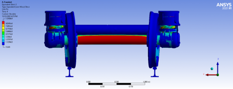 (2) In wheel 1, we see the large distribution of stresses on the bogie, not on the wheels. In wheel 4, the stress is due to the wheel's torsion inward and not the correct exit of the wheel. We also see the stresses that occur because of the derailment of the treads.