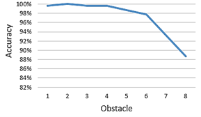 The obstacle of stairs or holes was also tested in the shoe test. Different hole depths were placed on the path of the volunteer (12 different hole depths). The volunteer shows the ability to detect and distinguish between the hole’s depth while using the proposed system, with a different sound frequency corresponding to a specific depth. Five tries are performed for each obstacle, and all 60 tries show the system succeeded. All the data are collected and analyzed to determine the system’s ability to detect the real depth, as shown in Figure 8 (a). The system shows high accuracy, an average close to 95% as shown in Figure 8 (b) high accuracy for the closest obstacle is important because it affects the user ability to avoid a drop-off in the holes or the stairs before reaching the ending point. the accuracy is degradant when the distance increase this is not the effect on the user because the object beyond the foot of the user.