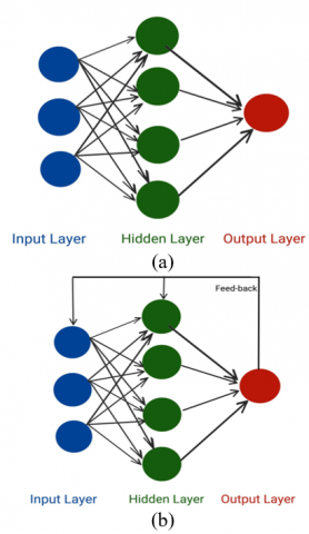 The most common connection ways are feed-forward neural networks and feed-backward neural network [23, 24]. In FFNN information flows only in one direction, from the input to the output layer without any recurrent connection, its typically used for tasks that do not require memory or temporal dependencies, such as image classification, regression, and pattern recognition and its well-suited for tasks with fixed-size input and output data. while FBN permits information to flow both from input to output and back into the network itself. This cyclic structure enables RNNs to have memory or "recurrent" behavior as shown in Figure 6 [23]. This memory is a key feature of RNNs and is what makes them particularly well-suited for tasks involving sequential data or time-dependent patterns. Training RNNs is more complex than FNNs due to the recurrent connections, so FNNs are chosen because they are simpler, more stable, and sufficient for the task.