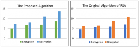 Nevertheless, this elongated key generation process can be regarded as a benefit as it bolsters the system's security by generating numerous keys based on the input length, thereby adding an extra layer of complexity. Furthermore, the encryption and decryption processes of the proposed RSA algorithm require more time compared to those of the original RSA algorithm, as they necessitate using two keys for each character. Despite these downsides, the proposed RSA algorithm enhances security through its key generation, encryption, and decryption methods.