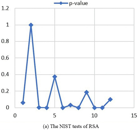 To evaluate the proposed algorithm's performance in terms of randomness, we subjected it to the NIST tests [15], using 12 tests chosen based on the length of the message encrypted (10000 bits). As known from the NIST tests, a p-value greater than or equal to 0.01 indicates randomness (otherwise, it failed). The results of the NIST tests showed that the proposed algorithm generated more randomness than the original RSA algorithm. Specifically, the output of the proposed algorithm passed all the NIST randomness tests, indicating that it generated a highly random sequence of numbers. In contrast, the output of the original RSA algorithm failed some of the tests, as shown in Table 3 and Figure 3.