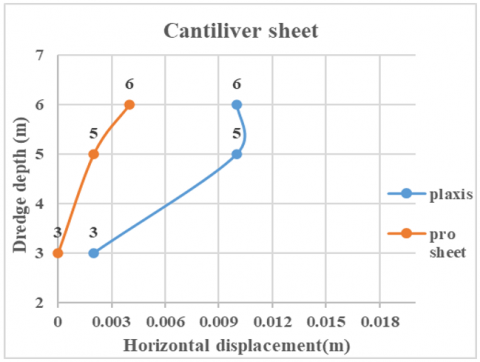 The investigation on sheet pile anchorage concentrated on horizontal displacements and driven depth. As demonstrated in Figures 51 and 52, a comparison analysis of the outcomes was conducted using ProSheet and the Plaxis program.