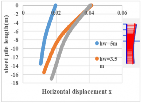 By applying a uniformly distributed load (5 KN/m2) to the sheet pile, penetration depths, and horizontal displacements under the influence from various water table levels are contrasted