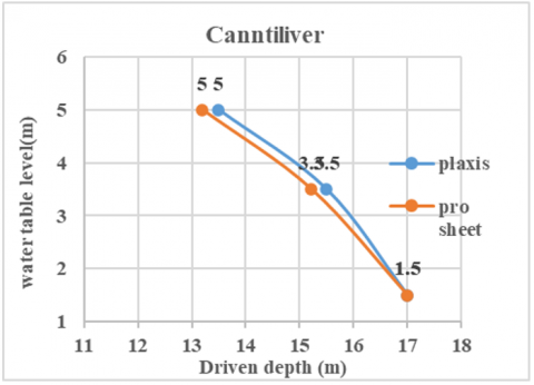 Figure 47. Cantilever sheet pile’s penetration depth under the impact of a variety of water table levels