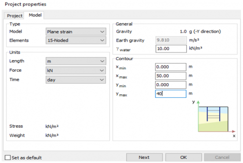 Figure 2. Model dimensions using the plane strain method and the Plaxis program [14]