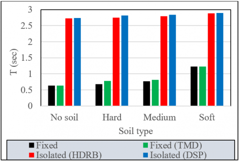 After 1971, SSI was given seriously attention and many research has investigated the importance of SSI for both fixed and isolated base structures [11]. Spyrakos et al. [12] revealed the importance of considering the SSI on the response of base isolated buildings. The study showed that the effect of SSI on system damping is small where the latter is influenced by the isolation system. Al-Jubair and Al-Mosawi [13] showed that considering the supporting soil has a negligible effect on base shear of base isolated structures. Bandyopadhyay et al. [14] studied the effect of SSI on fixed base and base isolated 3-storey reinforced concrete building. A dynamic analysis for fixed base building and building founded on soft soil was conducted by Kabtamu et al. [15]. The study depicted that considering SSI reduces the base shear but the inter storey drift will be increased. The influence of soil condition on multi-storey building with raft foundation was proven by Abdel Raheem et al. [16]. They found an inverse relationship between soil stiffness and the fundamental period of building. Soft soil gave higher storey displacement. Spyrakos et al. [17] showed that considering SSI is significant for light structures founded over low stiffness soil stratum. Bagheri et al. [18] carried out numerical simulation for structure with pile raft foundation to investigate the effect of soil pile interaction. Forcellini [19] showed that beneficial effects of base isolation systems are highly reduced when the structure located over deformable soil and SSI is considered. Edip et al. [20] showed that considering the side boundaries plays an important effect on seismic response of structures. Fatollahpour et al. [21] investigated the influence of considering SSI on 20-storey building response equipped with TMD at top storey. The results revealed that considering SSI can seriously increase the structure response in term of drifts. The use of TMD can improve the structure seismic performance when the soil stiffness value is medium or high [22].