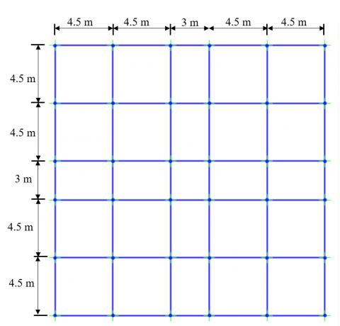 The studied 6-storey symmetric office building with raft foundation is shown in Figure 1 and the plan of the building is shown in Figure 2. The reinforced concrete columns of first storey have length of 4 m and cross-section of 500×300 mm. The columns of storey 2 to 6 are designed with length of 3 m and cross-section of 400×300 mm. The beams have a cross-section of 200×500 mm. The reinforced concrete slab has a thickness of 150 mm. The base of the raft foundation is either fixed without considering the SSI or interfaced with soil when considering the SSI.