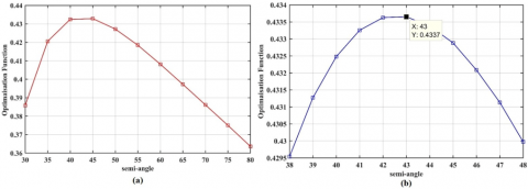 Figure 7. Optimize semi-angle: (a) Varied semi-angle from 30o to 80o; (b) Optimum semi-angle at 43o