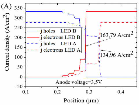 Figure 3 displays the distribution of the hole and electron current densities for both LEDs at 3.5V and 5V bias. The overall shape of both distributions is the same. The recombination mechanisms within the quantum wells seem to use up almost all of the hole current. In contrast, a substantial amount of the electron current escapes via the p-GaN and is not used up by the recombination process in the quantum well region. One of the main things limiting the effectiveness of traditional LEDs is this electron leakage. Due to significant non-radiative recombination and inadequate electron confinement, this leakage is especially noticeable in the case of LED A. In contrast, LED B has a larger current density, which suggests better electron confinement. In LED B, the hole current densities are much greater at 325.88A/cm², 316.92A/cm², 299.81A/cm², and 246.05A/cm² (jp lower than jn), but the electron current densities in the first four quantum wells at 3.5V bias are 10.66A/cm², 17.99A/cm², 34.25A/cm², and 88.67A/cm², respectively. The electron and hole current densities in the fifth quantum well, on the other hand, almost perfectly match j_holes=j_electrons=134.96A/cm² pour la LED A et j_holes=j_electrons=163.79A/cm² pour la LED B. The 21.38% increase in current density in your proposed structure demonstrates a more efficient injection of carriers into the active region. The electron current densities in LED B keep getting better at 5V bias. For instance, the electron and hole current densities in the fourth quantum well are exactly equal (j_holes=j_electrons=15.69mA/cm²). Since the electron current density in the fifth quantum well is somewhat larger than the hole current density (j_electrons=19.62mA/cm² and j_holes=12.80mA/cm²), radiative recombination is improved due to better control over electron overflow.