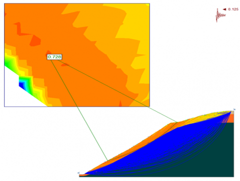 In Figure 11, the pseudostatic analysis using the Janbú method gives an FS of 0.728, confirming the instability of the slope in seismic situations.