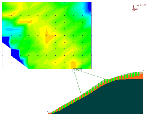In Figure 14, the analysis under pseudostatic conditions, with the presence of Kikuyu grass roots with the Bishop Method shows an FS of 1.278, indicating a considerable improvement in the seismic stability of the slope.