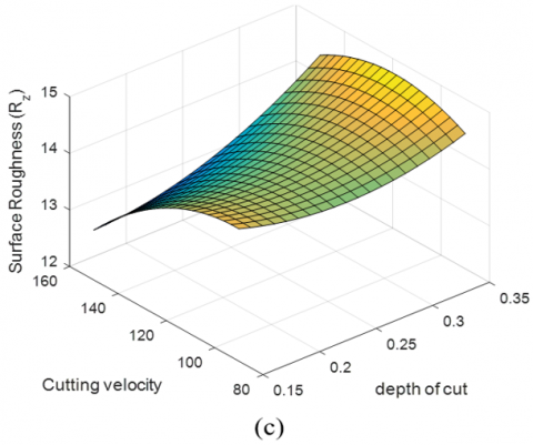 Response surface methodology (RSM) is a statistical method regularly used to develop experimental models in the machining process. This study uses RSM to create a second-order approximation model for predicting surface roughness in turning machining. The relationship between cutting parameters and surface roughness can be characterized by a multivariate function, including cutting velocity, feed rate, depth of cut, and concentration of nano-CuO in coconut oil, expressed in Eq. (2).