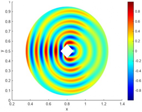 In a specific scenario involving straightforward scattering, we analyze how incident waves from the left are reflected by a square object. The model considers an infinite horizontal membrane that is slightly displaced vertically, anchored securely at the object's perimeter. Within this homogeneous medium, the phase velocity of the wave remains constant.