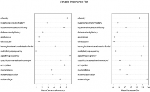 According to Figure 7, both MeanDecreaseAccuracy and MeanDecreaseGini help us understand the significance of individual features in a Random Forest model. MeanDecreaseAccuracy provides insights into how characteristics affect overall model accuracy, while MeanDecreaseGini focuses on their ability to reduce impurity and improve class separation in the decision trees. The higher the value of MeanDecreaseAccuracy or MeanDecreaseGini score, the higher the importance of the variable in the model. In the Figure 7, age at first pregnancy, maternal age, hemoglobin level, hypertension, personal history, and ethnicity are five essential variables.