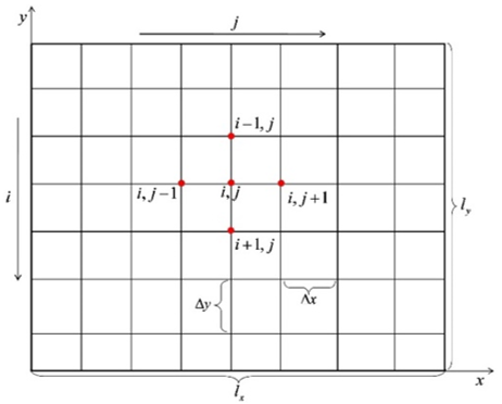 Now discretizing the Eq. (1) in the domain using a second order finite difference scheme with the help of the grid shown in Figure 2 will result in Eq. (2).