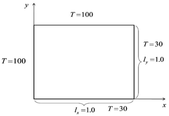 In this figure, the rectangular domain represents a two-dimensional surface where heat conduction is happening in a steady-state manner. Each boundary of this domain is held at some fixed temperature ($T$), simulating the thermal conditions one might encounter in a heated metal plate or a similar planar material. This arrangement will allow to focus on heat conduction within the boundaries without the need for external influences. The domain length in $x$ and $y$ directions are ${{\ell }_{x}}$ and ${{\ell }_{y}}$ respectively, and it has been assumed that the temperature variation occurs only within this plane (i.e., there is no variation normal to the plane). This assumption is often valid for thin plates where the thickness of the plate is small compared to the other dimensions. The boundary temperatures of the domain are specified. The domain length in $x$ and $y$ directions are ${{\ell }_{x}}$ and ${{\ell }_{y}}$ respectively. As there is no variation in the temperature in the directions normal to the plane of paper, the problem comes under the category of 2D conduction.