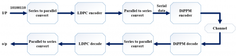 Hard decisions and soft decisions are the two main categories of decisions that are included in the iterative parity check decoder. For soft judgments, a message-passing method called the Sum-Product Method (SPA) is employed. Each bit's input is represented as the probability of earlier knowledge obtained from the channel. Previous study [23] indicates that there are three different forms of SPA classification: Probability Domain, Log Domain, and Min-Sum SPA. The classification is predicated upon the structural composition of the message exchanges occurring between variable nodes and check nodes. The DiPPM system model using LDPC coding is displayed in Figure 4.