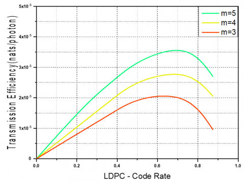 Figure 9. The effect of LDPC code rate on coded OPPM system transmission efficiency