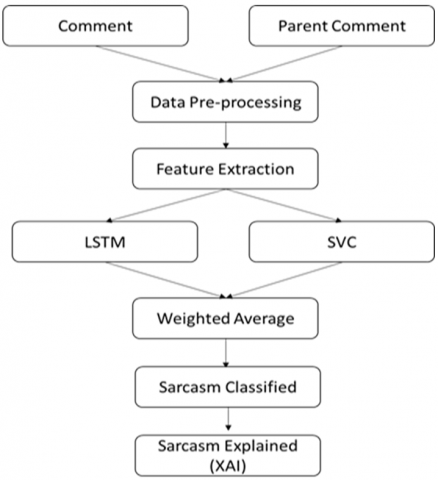 To increase commercial value, researchers are concentrating on domain-specific text sarcasm detection with an explainable approach. After conducting a thorough state-of-the-art analysis, researchers employed a combination of ML and DL methods with an ensemble approach to create a better sarcasm detection system. With the proposed methodology, researchers are attempting to use Explainable Artificial Intelligence (XAI) to identify sarcasm in writings that are peculiar to a given topic. Explainable AI approach is used in many languages by many researchers [5-7] for sarcasm detection to interpret the model outcome SVC and LSTM make up the proposed architecture for sarcasm detection. The counterfactual explanation approach is used to analyze the explainability of AI models. Figure 1 shows a proposed architecture of experiment analysis.