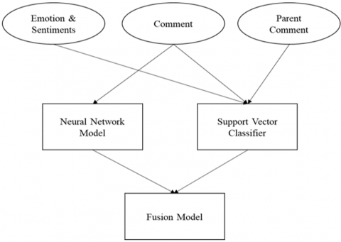 Along with LSTM one more model is trained on same dataset with different feature set. SVC classifier is trained on comment, parent comment and some feature combination such as emotions and sentiment. SVC generated training F1 score as 75.53% and testing F1 score as 74.57%. As a final classification result, weighted average of LSTM and SVC classifier is calculated. The final weighted average approach F1 score is 77.07% and testing F1 score as 75.75%.
