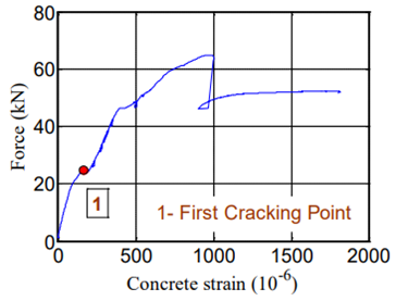 Moreover, Figures 5(b) and (c) offer insights into the correlation between load and both steel and concrete strains. These figures illustrate the response of these materials when subjected to applied loads. Notable observations from this specimen include the point of yielding, which occurred at 51.64 kN, and the recorded displacement at the yield load, The displacement measured was 7.74 mm, and the maximum recorded load reached 72.94 kN, followed by a sharp decline in the load. The increase in the maximum load was significant, marking a notable 52.29% rise when contrasted with the control specimen. These findings offer valuable insights for analyzing and discussing the behavior and performance of this particular specimen examined in the study [11]. In this section, we present a comparative assessment between the compressive strain and load deflection data sourced from both the finite element analysis and the experimental measurements for the concrete situated at the center of the upper surface of the specimen. This comparative evaluation is visually represented in Figure 6. It is worth highlighting that there is a robust concurrence and alignment between the outcomes of the finite element analysis and the experimental data pertaining to compressive strain within the concrete material [10].