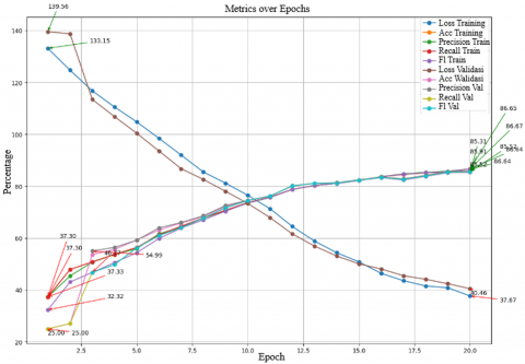 Based on the testing results of the MobileNetV2 model with a learning rate of 0.05, batch size of 32, and RMSProp optimizer, there is significant variation in model performance across several epochs as shown in Figure 6. Training accuracy shows a consistent improvement, starting from 46.05% in the first epoch and reaching 87.15% in the final epoch. Training precision also improves, with a minimum of 44.98% and a maximum of 87.08%. Training recall ranges from 46.05% to 87.15%, and the training F1 score varies between 43.69% and 87.10%. For validation, validation accuracy starts at a low value of 25.31% and increases to 84.22% by the final epoch. Validation precision fluctuates, with a minimum of 58.20% and a maximum of 84.41%. Validation recalls ranges from 25.31% to 84.22%, while the validation F1 score varies from 57.43% to 84.21%. Training loss decreases from 1.2394 at the beginning of testing to 0.3436 in the final epoch, indicating that the model is learning to reduce errors over time.