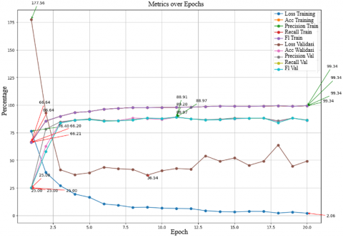 Table 3 shows the best test results, namely in scenario 5 with a learning rate of 0.0001 with a batch size of 64 and using the RMSProp optimizer with accuracy, precision and recall and F1 score of 99.34%.