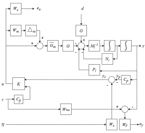 To design an H-infinity controller, the two degrees of freedom control configuration in Figure 3 has to be in the general robust control configuration of Figure 4 where $P$ represents the generalized plant model. $\Delta$ represents the normalized model uncertainty $\left(\|\Delta\|_{\infty}<1\right)$, $u$ represents the control signals, $w$ represents the weighted exogenous signals ($d, r$, and $\eta$) in Figure 3, $z$ represents the weighted error signals of interest ($e_u$ and $e_x$) in Figure 3.v represents the controller input ($y_s$ and $C_p r$). $u \Delta$ and $y_{\Delta}$ represent the perturbed input and output, respectively.