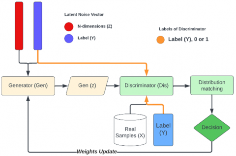 Generative modeling is an unsupervised learning technique in ML that enables the identification and understanding of patterns or regularities in the input data. These patterns may then be utilized to generate new examples or outputs based on the original dataset. GANs are a framework that enables the automatic training of a generative model by treating an unsupervised problem as a supervised one. This work is achieved by utilizing a generative model, which creates new data, and a discriminative model, which distinguishes between real and generated data [23]. An example of this method is the conditional GAN (C-GAN) created by Mirza [24]. C-GANs utilize a latent vector associated with a label to generate new images based on the given label.