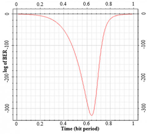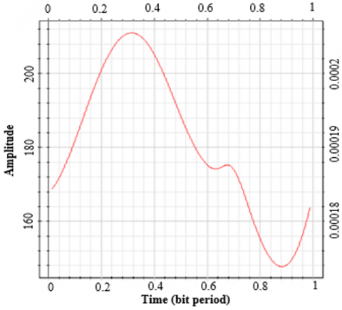 Eye height due to DWDM effect: The measured eye height of 0.0294991 indicates a relatively large vertical distance between the highest and lowest points of the eye chart, as shown in Figure 6. A high eye height shows that the received signals have a large margin above the noise floor, enabling reliable bit detection and improved resistance to attenuation. It is a positive sign, indicating good signal quality and sufficient signal strength, even with densely packed DWDM channels.