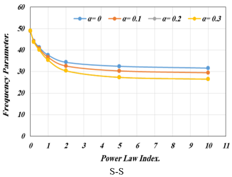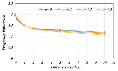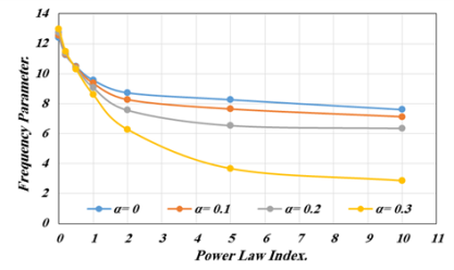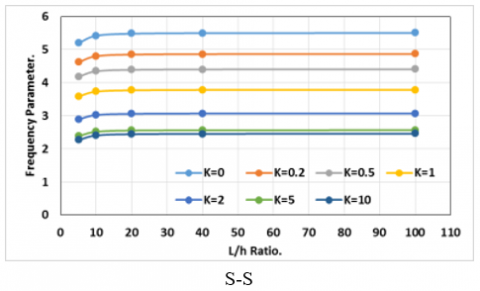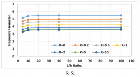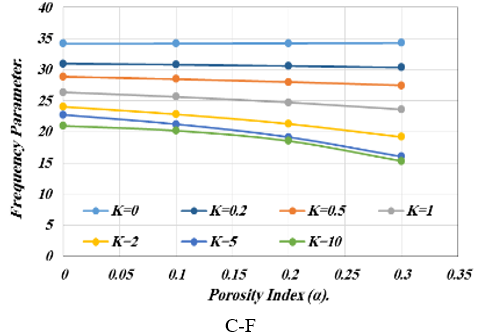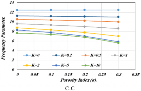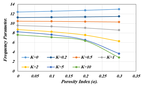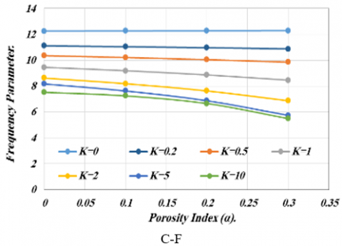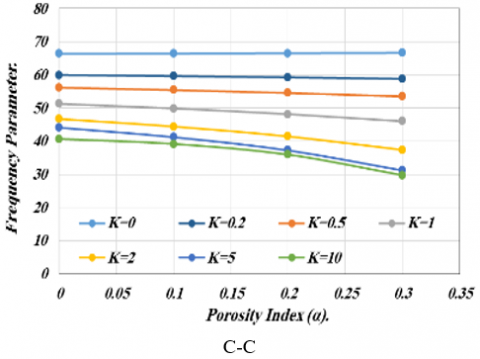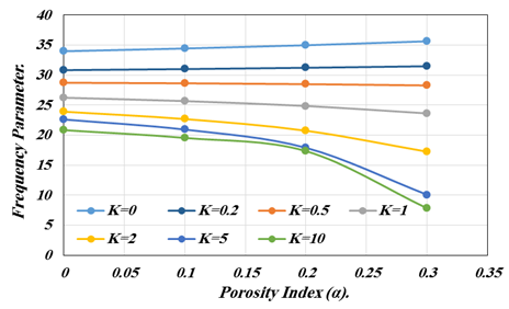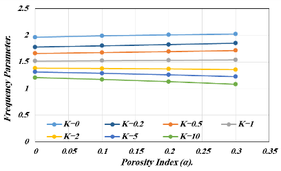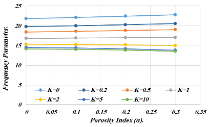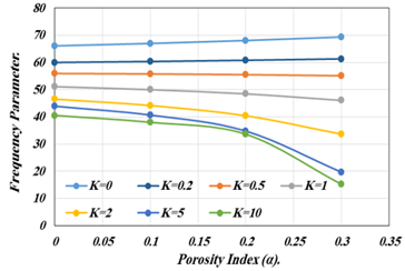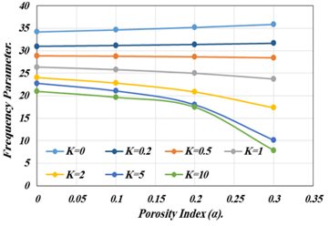 In order to investigate the impact of porosity index, the porosity in porous-FGB is assumed to effect averagely on the material properties [1]. This means the porosity is found in metal and ceramic materials at the same time and the impact of porosity depends on porosity index and function of porosity distribution in additional to average of the modulus and density of metal and ceramic (see Eq. (2)). In even porous-FGB, the function of porosity distribution is constant and don’t depend on the position in height of beam, i.e., z direction. Generally, the porosity existence causes reduction in material properties elastic modulus and density. For pure metal beam, the reducing rate of modulus due to porosity is larger than the reducing rate of density, therefore, the part $\sqrt[2]{\frac{E}{\rho}}$ reduces and this leads to increase the frequency of pure beam. But for pure metal beam, the reducing rate of modulus due to porosity is smaller than the reducing rate of density, therefore, the part $\sqrt[2]{\frac{E}{\rho}}$ reduces and this leads to decrease the frequency of pure beam. For porous-FGB, i.e., $0 \leq \mathrm{K} \leq \infty$, the increase of porosity index affects reversely on the frequency of beam while increase of the power-law index affects proportionally on the frequency of beam. In other words, the impact of power-law index is opposite to the impact of porosity index and the part $\sqrt[2]{\frac{E_{e q}}{\rho_{e q}}}$ depends on the combination effect of these two indices. Therefore, the part $\sqrt[2]{\frac{E_{e q}}{\rho_{e q}}}$ decreases at high porosity index and at any power-law index. It can see that the frequency decreases when the porosity index increases at high power-law index.