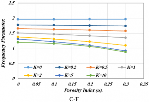 Figure 9 illustrates the natural frequency parameters results of even porous-FGB when the porosity index α increases from zero to 0.3 for various supporting type and power-law index K. For first mode, the frequency parameter reduces when the power-law index K rises at any porosity index and any supporting types (see Figure 9(a)). In other side, the impact of porosity index is differing and depending on power-law index. For example, the frequency parameter increases when the porosity index increases at K=0, while, for K=10, For any supporting type, the frequency parameter falls as the porosity index rises. In other hand, the frequency parameter of C-C beam is larger than that of S-S and C-F beams (see Figure 9(a)). The same behavior is found in second and third natural frequencies (see Figure 9(b) and (c)). Also, the value of frequency parameter increases with increasing the mode number.