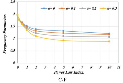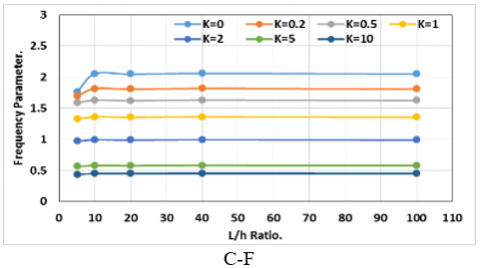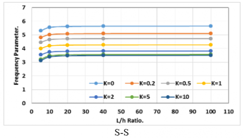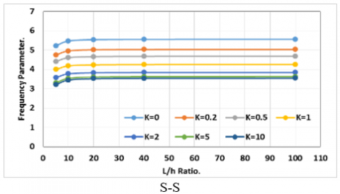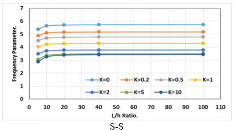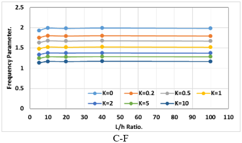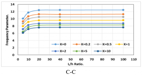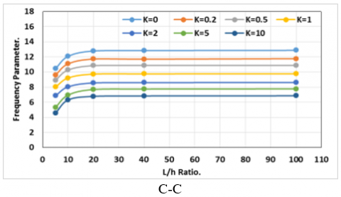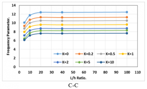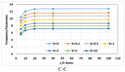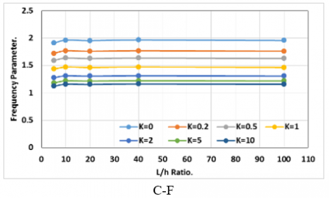 The impact of length/height ratio on the first natural frequency parameter of porous, Even, Uneven-I and Uneven-II. FG beam under different supporting types for different power-law and porosity index are shown in Figures 15-17 respectively. Generally, the effect of length-to-height ratio on the first frequency parameter vanishes when the length-to-height ratio is greater than 20 for any supporting type, power-law index and porosity index. Also, the effect of length- to-height ratio on the first frequency parameter of C-C porous-FGB is greater than that of S-S and C-F porous-FGB respectively for any power-law index and porosity index. The reason of this behavior is similar to that described previously. The shear effect due to variation in material properties is small when the length-to-height ratio of porous-FGB increases, therefore the variation in the first frequency parameter decreases.