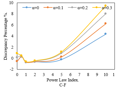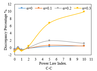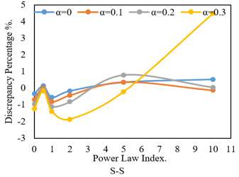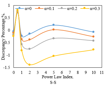 Figure 6. The discrepancy percentage of the frequency parameter of pours-FGM for various porosity index, supporting type, and power law index for Even distribution function of porosity